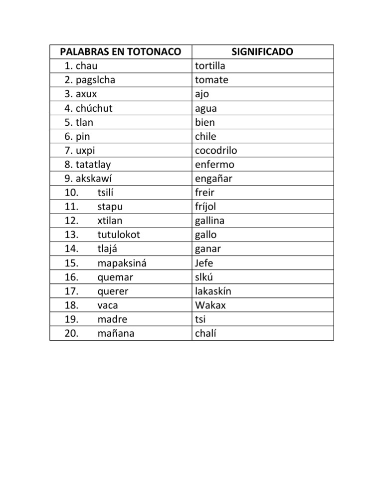 Palabras En Totonaco Y Su Significado En Español
